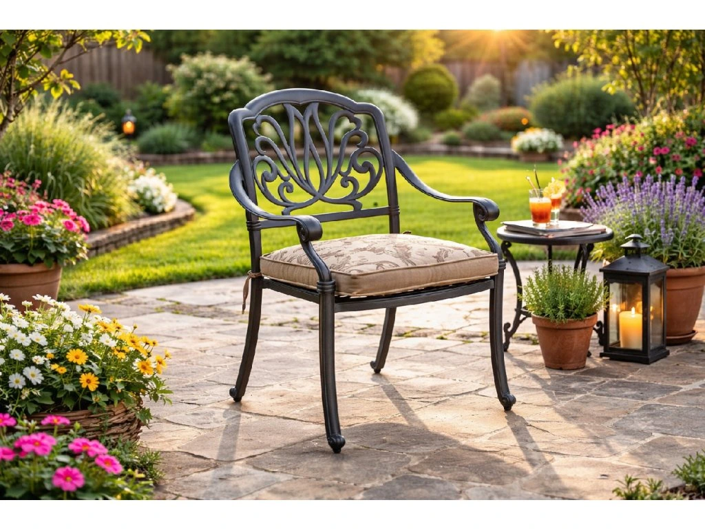 Zahradní židle Amalfi je vyrobena z litého hliníku v romantickém stylu. V kombinaci s polstrem je tato jídelní židle velmi pohodlná. Sedák je součástí židle.