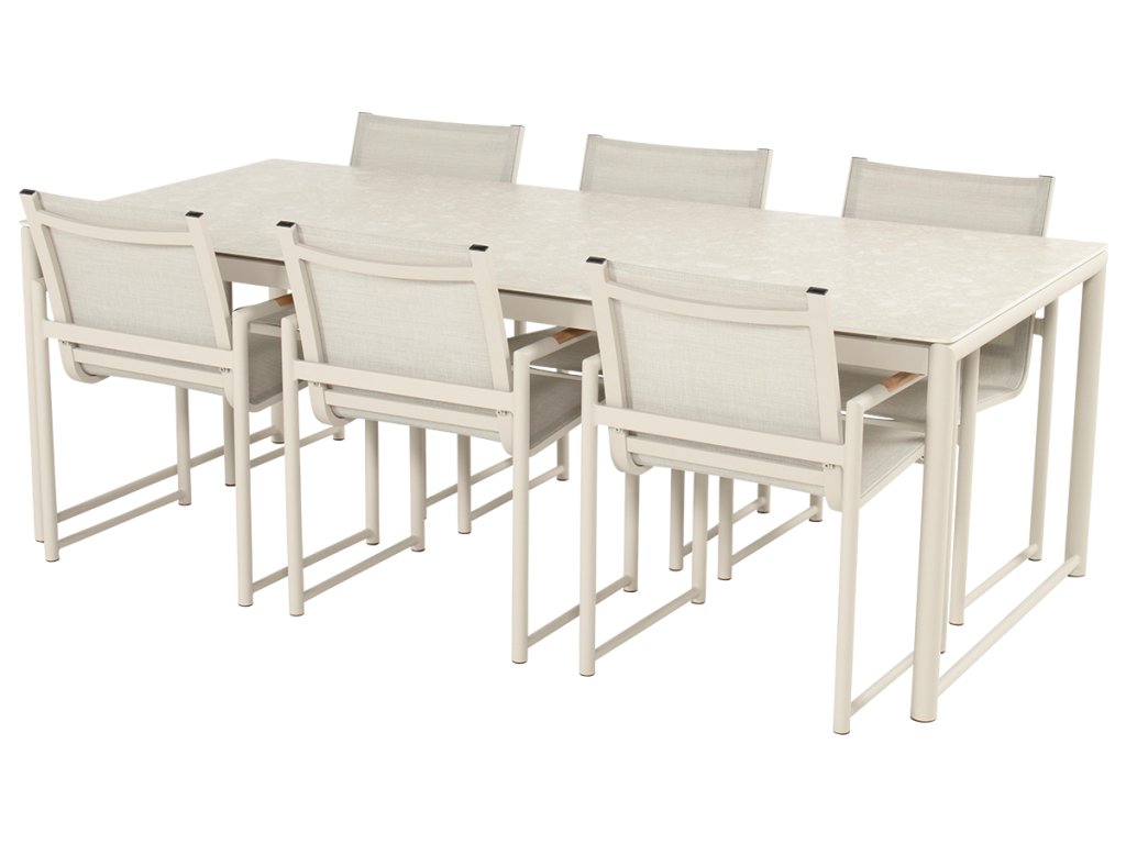 Tato zahradní souprava Hartman Fontaine obsahuje 6 židlí + stůl o rozměru 240x100cm. Kostra stolu je vyrobena z hliníku v barvě sand a keramické desky. Křesla mají hliníkový rám v barevném odstínu samd a sedák je vyroben z umělé textilie v barvě sand. Materiál je speciálně upraven na venkovní použití.