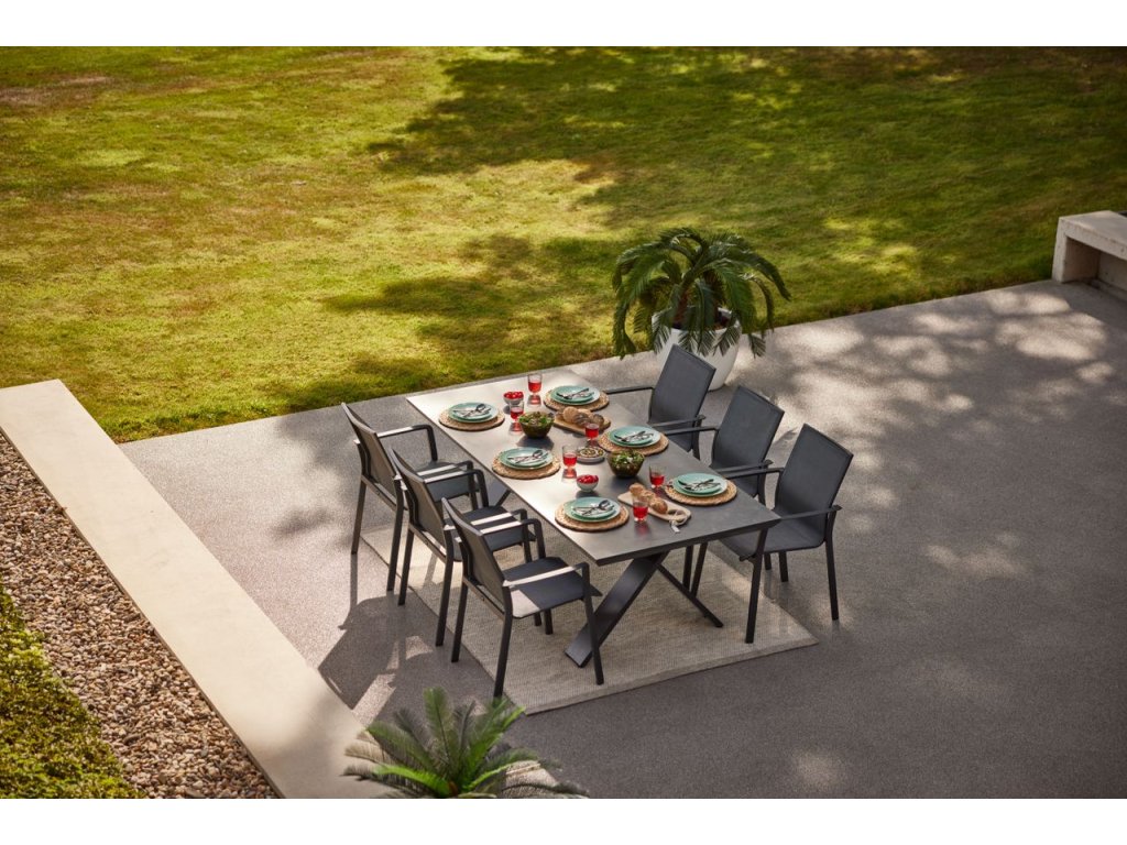Jedinečný a stylový je tento jídelní stůl Hartman Xanada díky své originální podnoži. Tato řada z kolekce Hartman je novinkou na trhu. Stůl má krásný design, skládá se z hliníkového rámu a sklokeramické desky. Deska snese dostatečné zatížení (50 kg), nenasákavá vodu a vyžaduje minimální údržbu. V kombinaci s pevnými i polohovacími křesly Hartman vytvoříte dokonalou soupravu pro příjemný odpočinek. Kostra nábytku je hliníková. Nábytek je vyroben z materiálů, které jsou přizpůsobeny venkovnímu prostředí. Robustní materiály jsou odolné vůči povětrnostním vlivům a mají nízkou údržbu. Ideální pro ty, kteří hledají moderní design.