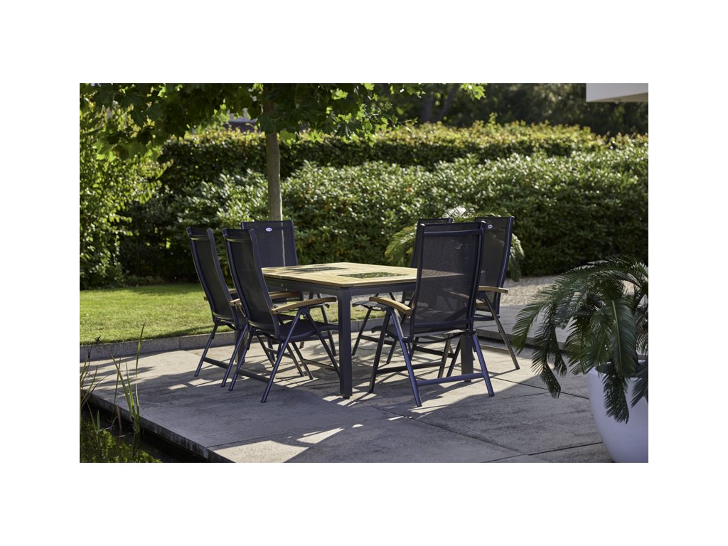 Luxusní polohovací zahradní křeslo Hartman Troy z hliníku s textilním výpletem a teakovými područkami.