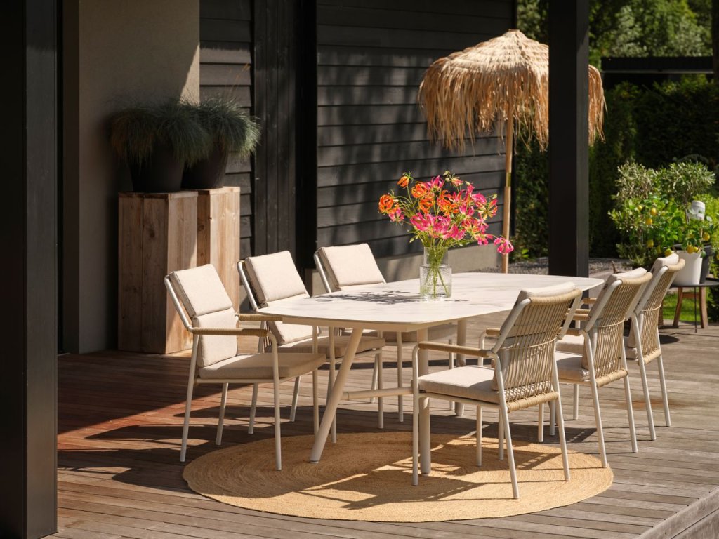 Benevento je zahradní stůl vyrobený z vysoce kvalitních materiálů. Rám je celý z hliníku, ale to, co dělá stůl tak výjimečným, je keramická deska. Tyto materiály jsou extrémně pevné, odolné vůči různým povětrnostním vlivům a velmi snadno se čistí. Stůl, který posune vaši zahradu na vyšší úroveň. Deska snese dostatečné zatížení (50 kg) a vyžaduje minimální údržbu. V kombinaci s křesly Hartman vytvoříte dokonalou soupravu pro příjemný odpočinek. Pro své rozměry je vhodný i pro více osob. Nábytek je prvotřídní kvality. Stůl je velmi luxusní, zvláště v kombinaci s křesly Hartman. Ideální pro ty, kteří hledají moderní design.
