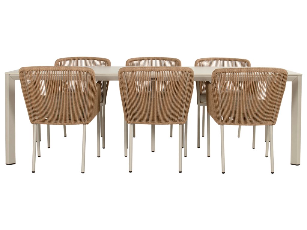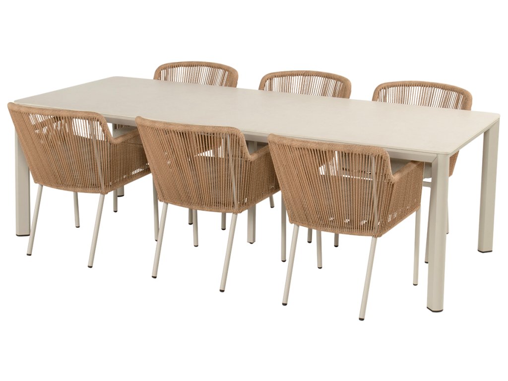 Konstrukce zahradní jídelní židle Hartman Cairo je vyrobena z hliníkové kostry barvy sand a provázky jsou elegantně spleteny a působí velice luxusně a jedinečně. Je pevná, velmi stabilní a opravdu pohodlná. Provázkový výplet odolá povětrnostním vlivům, UV-záření, chloru i slané vodě. S tímto zahradním křeslem z kolekce Hartman získáte maximální oporu v zádech, abyste mohli dlouho pohodlně sedět. Tato zahradní židle Hartman z řady Cairo je novinka od firmy Hartman. Polstry jsou součástí křesla. Zahradní jídelní stůl Hartman Kyra je vyroben z hliníku a keramické desky. Oba materiály jsou nenáročné na údržbu. To vám umožní bez obav nechat zahradní stůl venku po celý rok. Krásně koordinuje s jídelními židlemi v barveném provedení sand. Stůl má nadčasový a elegantní vzhled.
