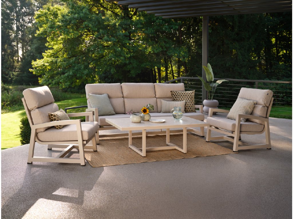 Tato zahradní souprava Gio Hartman vás zaujme na první pohled. Hodí se nejen do exteriéru - do zahrady, na terasu nebo na balkon, ale využití najde i v interiéru. Polstrování je šité přímo na míru a dodává zahradnímu sezení naprostou pohodlnost. Díky rychleschnoucí náplni a nenasákavé textilii i po vydatném dešti rychle vyschnou. Doporučujeme polštáře během zimy skladovat na suchém místě, aby zůstaly krásné po mnoho let. Nábytek je vyroben z hliníku v barvě sand. Rám s textilenovou úpravou je ideální pro venkovní použití a nevyžaduje žádnou údržbu kromě každoročního čištění