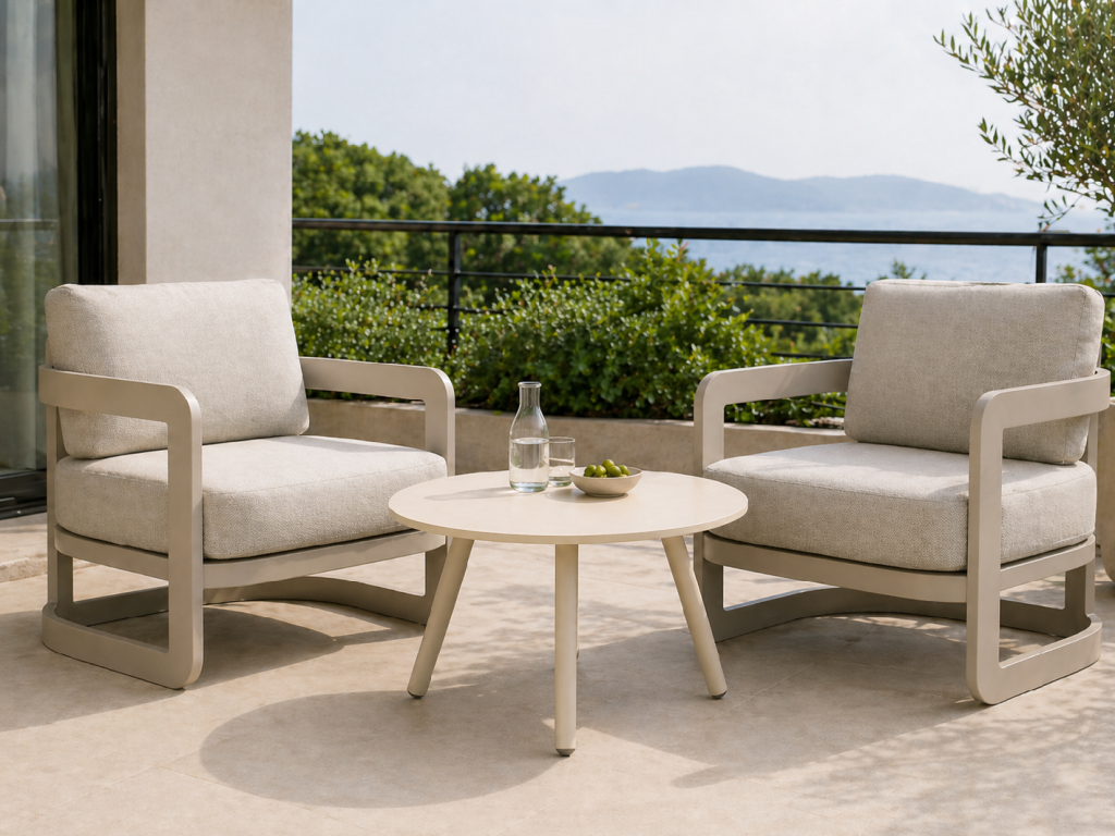 Hliníková konstrukce v odstínu sand působí moderně, je pevná, odolná a vhodná pro každodenní venkovní používání. O vaše pohodlí se postarají měkké polstry, které zpříjemní každou chvíli odpočinku. Stolek s keramickou deskou dodává celé sestavě elegantní a prémiový vzhled a zároveň se snadno udržuje.