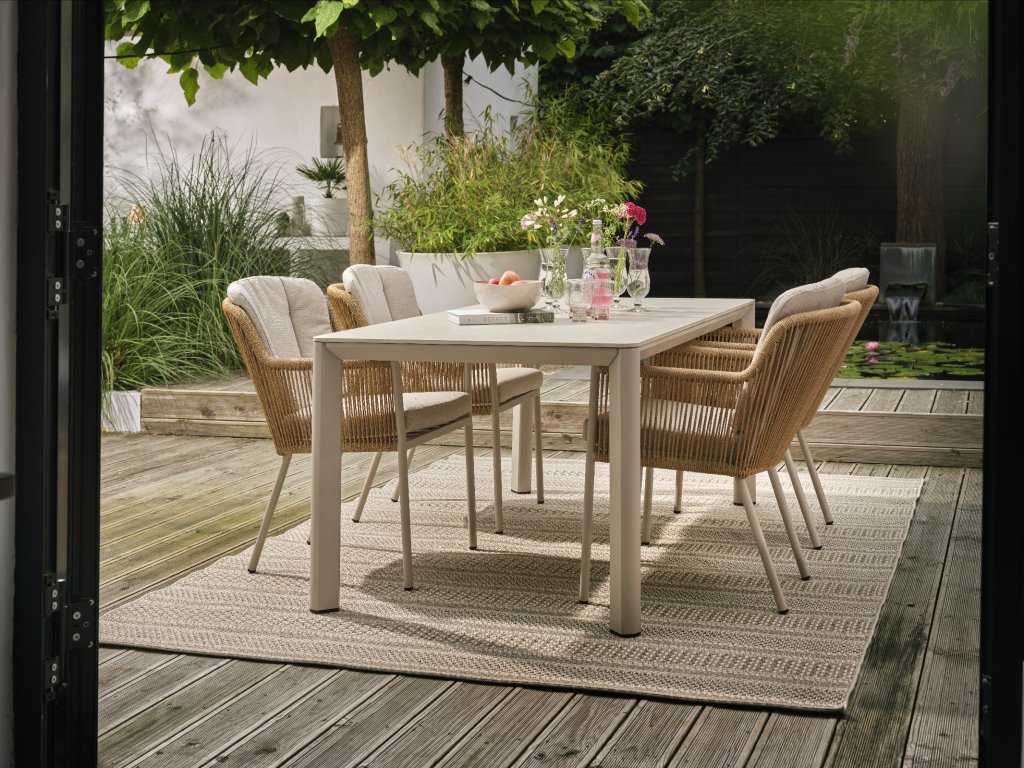 Cairo Hartman je zahradní jídelní křeslo s provázkovým výpletem a sedáky.